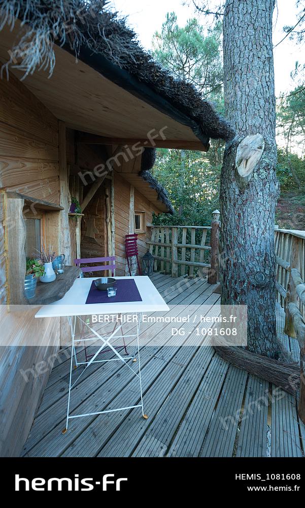 France, Morbihan (56), Nivillac, terrasse d'une cabane du site d'hébergements insolites le Pertuis du Rofo