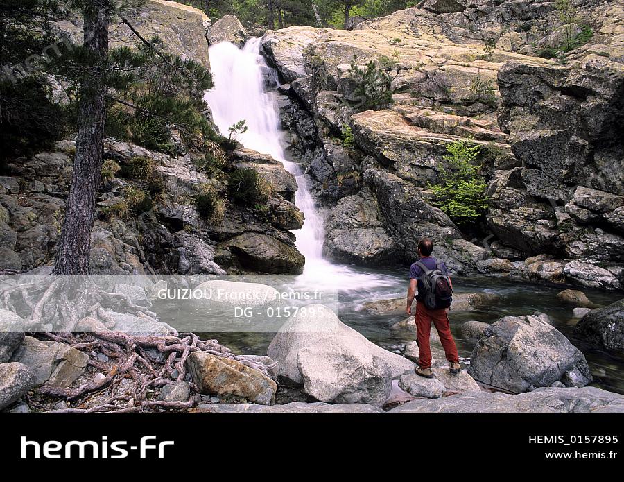 France, Haute-Corse (2B), forêt de Vizzavona, randonneur à la cascade des Anglais sur le GR 20