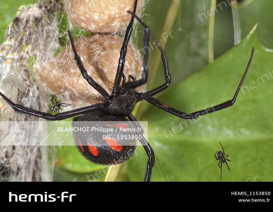 Italy, Araneae, Theridiidae, Mediterranean black widow or Steppe spider (Latrodectus tredecimguttatus), female protecting its cocoon