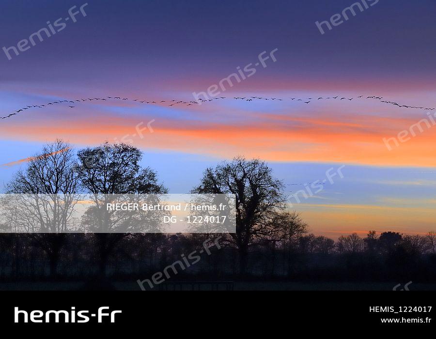 France, Indre, Berry, Parc Naturel Regional de la Brenne (Natural Regional Park of La Brenne), Rosnay, Red Sea pond (etang de la Mer Rouge), Common Crane (Grus grus), flight at sunset