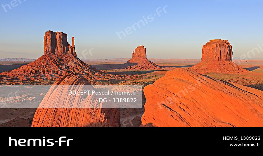 Etats-Unis, Arizona, réserve indienne des Navajo, Monument Valley Tribal Park, coucher de soleil sur les Mittens et Merrick Butte