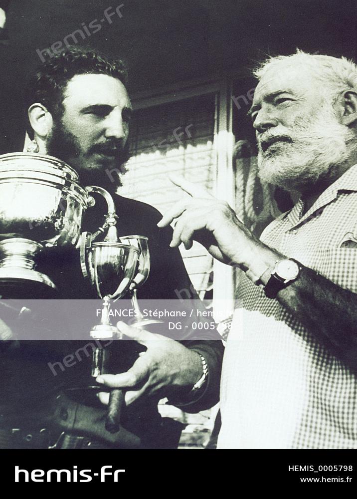 Cuba, Havana Habana Vieja district, listed as World Heritage by UNESCO, photograph of Ernest Hemingway and Fidel Castro at fishing competition hanging at Hemingway's house