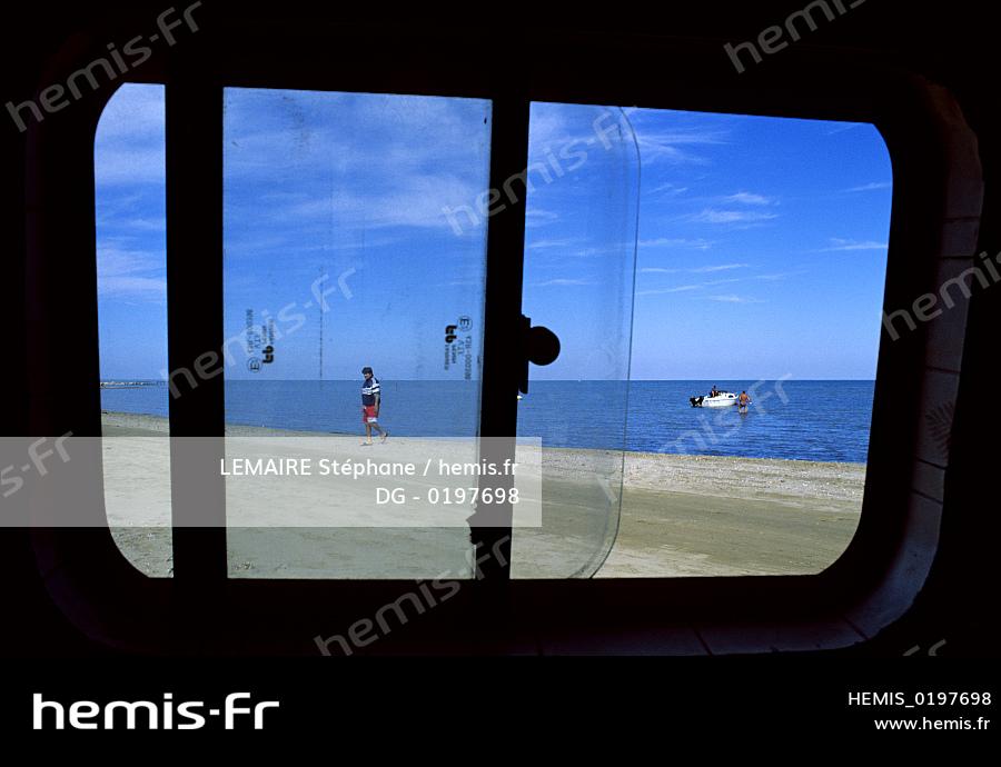 France, Bouches-du-Rhône (13), Camargue, Salin-de-Giraud, le village sauvage de Beauduc, la plage vue d'un camping-car
