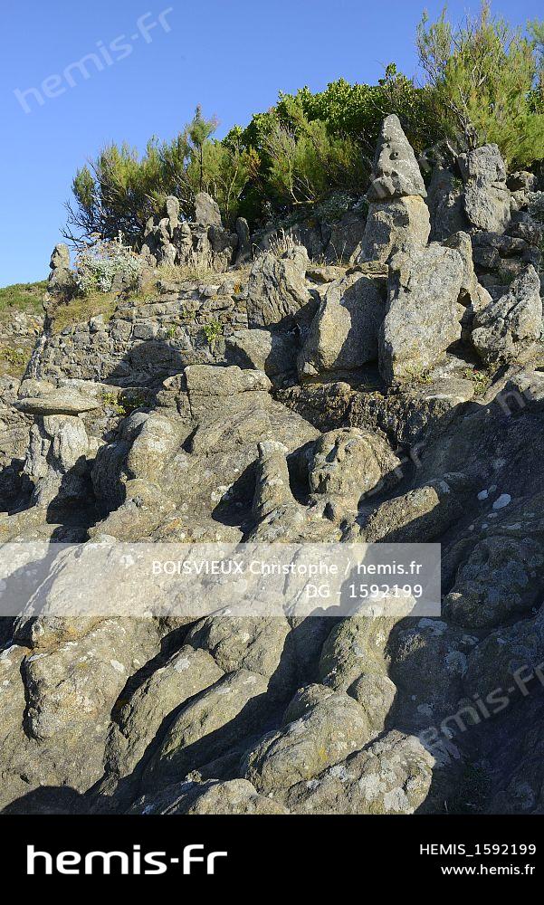 France, Ille et Vilaine, Saint Malo surroundings, Rotheneuf, Les Rochers Sculptes the Abbe Foure (1839-1910), having suffered a stroke at the age of 30, which left him paralyzed on one side, retreated to a life as a hermit in the cliffs of Rotheneuf He carved over 300 fascinating, grotesque and bizarre faces und figures into the rock