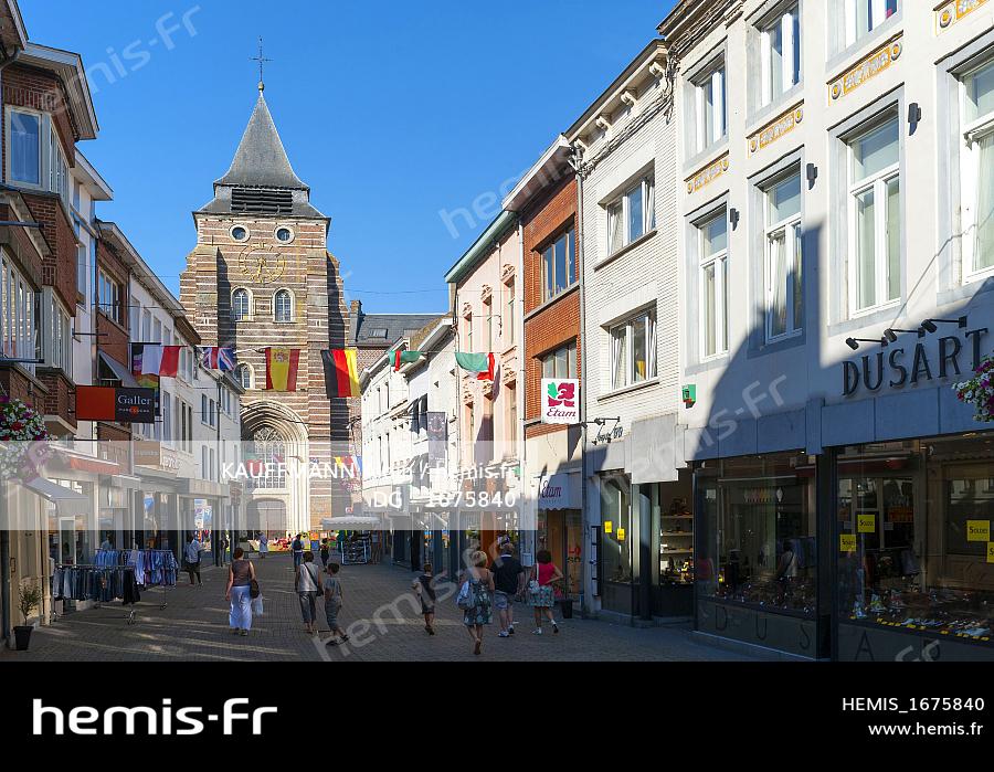 Belgique, Wallonie, Wavre, rue piétonne avec personnages et son église en fond
