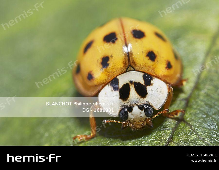 France, Coleoptera, Coccinellidae, Coccinelle asiatique ou Coccinelle arlequin (Harmonia axyridis), 5 mm, portrait