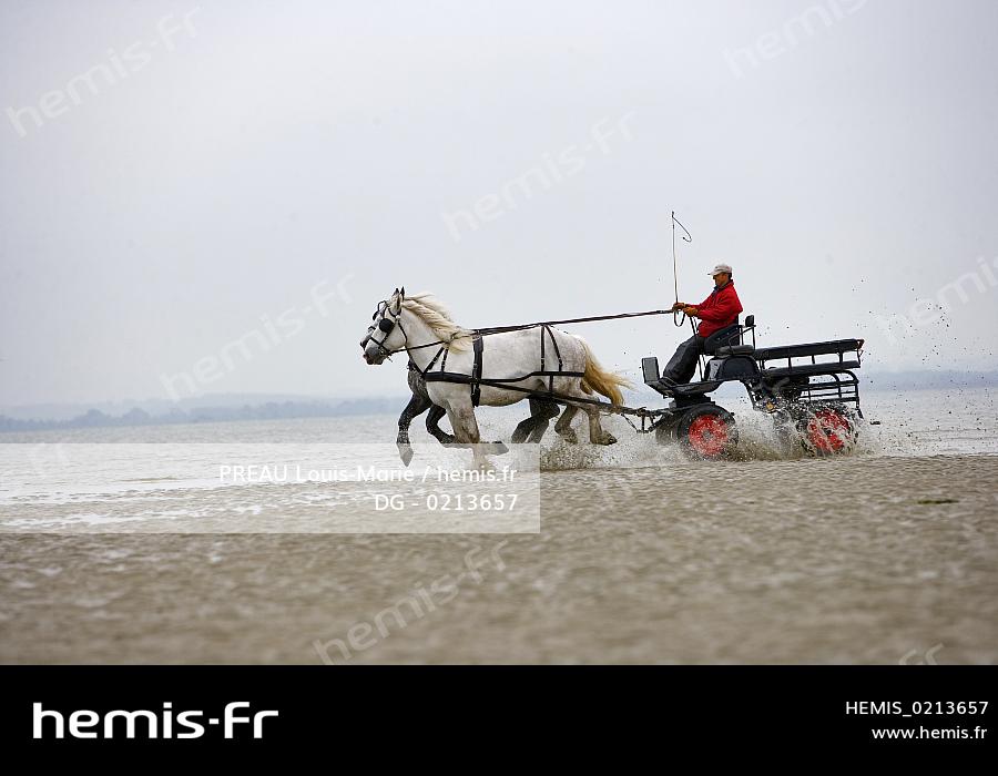 France, Somme (80), Baie de Somme, calèche et chevaux de trait boulonnais