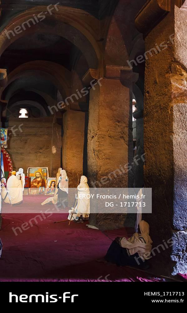 Ethiopia, Amhara region, Lalibela, churchgoers inside the rock-hewn church Bet Medhane Alem listed as World Heritage by UNESCO