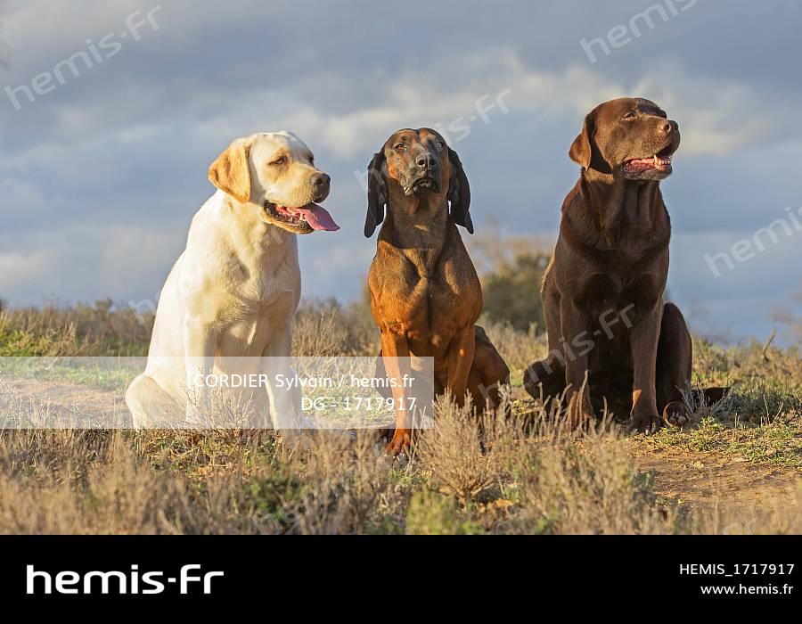 Espagne , Castille-la-Manche , environs de Guadalajara, un chien Rouge de Bavière et deux variétés de Labrador retriever