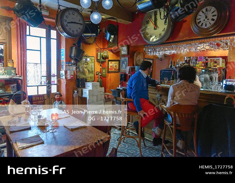France, Bouches du Rhone, Saint Remy de Provence, Mariés bar, restaurantdecorated with multiple objects of secondhand trade, consumers sat in front of a counter in a vintage atmosphere with clocks suspended from the ceiling
