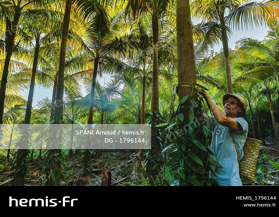 France, Reunion island (French overseas department), Saint Philippe, Basse Vallee, Vanilla cultivation, traditional scene of vanilla cultivation, Louis Leichnig, from Domaine Leichnig, one of the architects of the registration in 2021 of vanilla from La Réunion with the IGP label