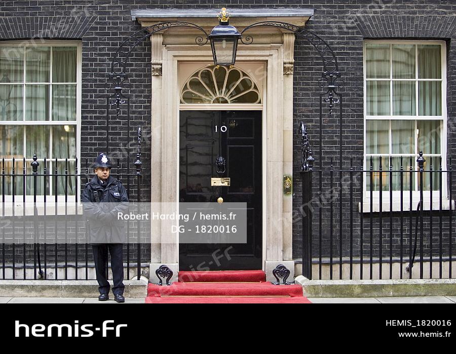 Royaume-Uni, Londres, un policier armé garde le numéro 10 de Downing Street, domicile officiel du Premier ministre britannique
