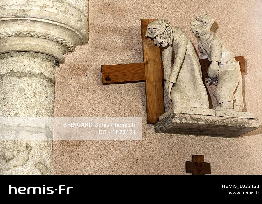 France, Doubs (25), Orchamps-Vennes, église Saint-Pierre et Saint-Paul du XVIe siècle, chemin de croix par le sculpteur Gabriel Saury 1947, Simon aide Jésus à porter sa croix