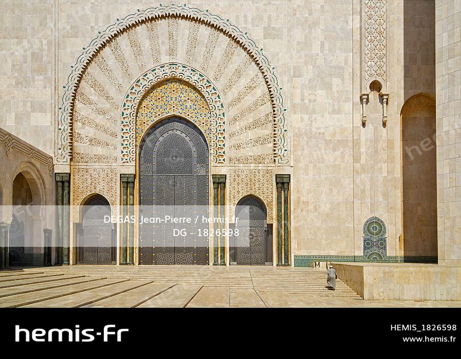 Morocco, Casablanca, Big Mosque Hassan II of Muslim Arab style built by the architect Michel Pinseau in 1986, the man going up steps