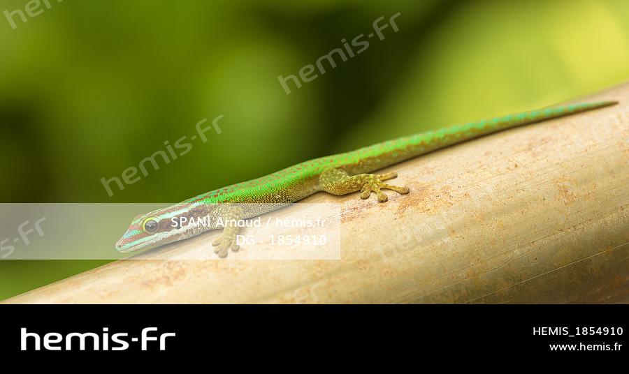 France, Reunion island (French overseas department), Parc National de La Reunion (Reunion National Park), listed as World Heritage by UNESCO, Saint Joseph, Manapany les Bains, green lizard