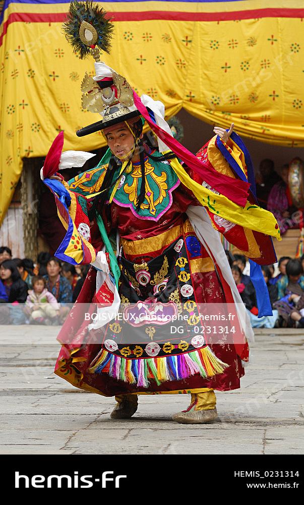 Bhutan, Punakha, Punakha Tsechu festival. The dancer wear a gold-winged, skull-capped helmet. The dance of the Black hats commemorates the murder in the year 842 of the Tibetan tyrant Langdarma, great destroyer of the Buddhism. The steps of the dancers make a mandala and draw in the space the triumph of the Buddhism over evil spirits.