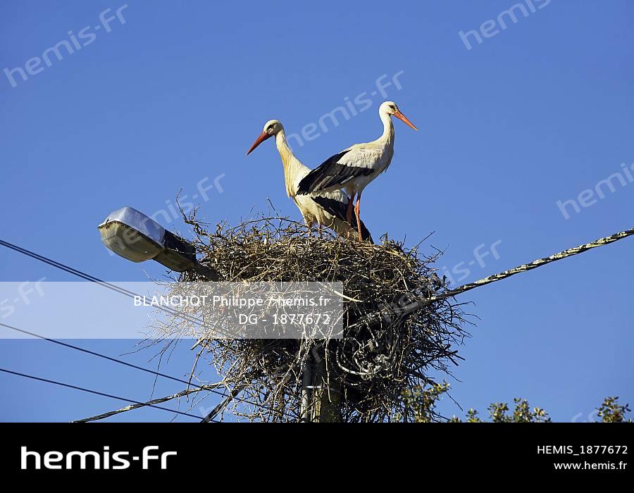 Portugal, Algarve, Monchique, Pair of White storks (Ciconia ciconia) perching on their nest