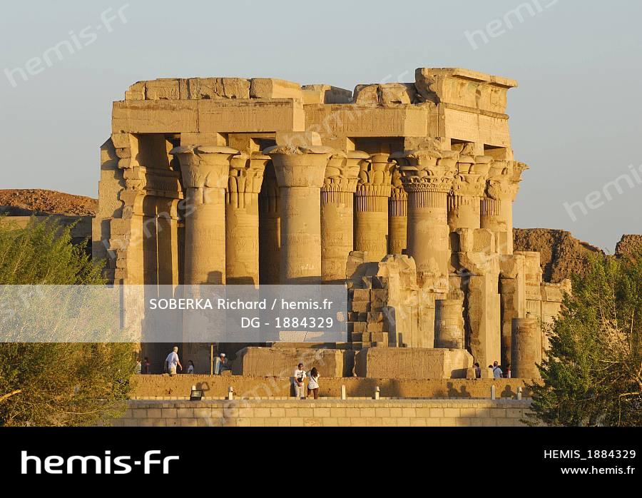 Egypte, Haute-Egypte, Kom Ombo, temple dédié à deux divinités : le dieu faucon Haroëris ou Horus l'ancien et le dieu crocodile Sobek, vue extérieure au coucher de soleil