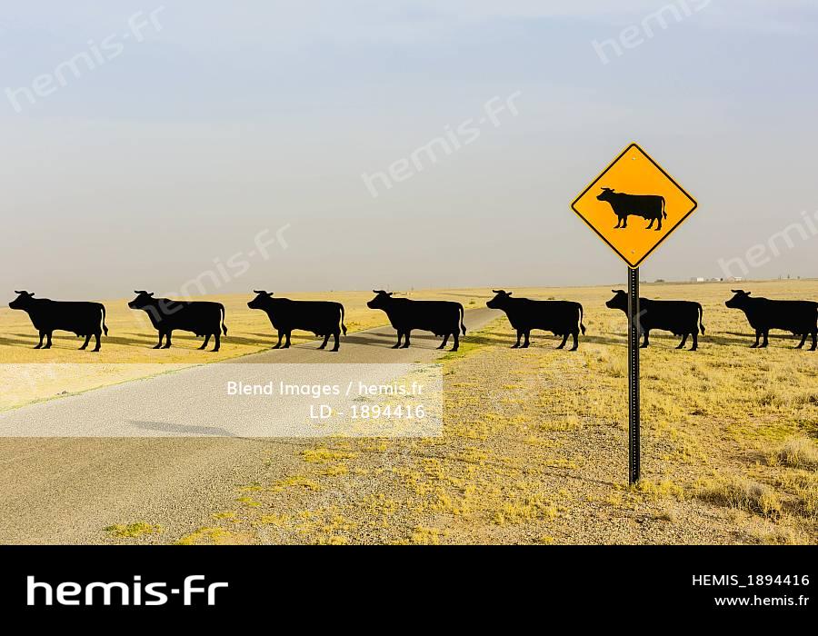 Cows crossing road behind cow crossing sign