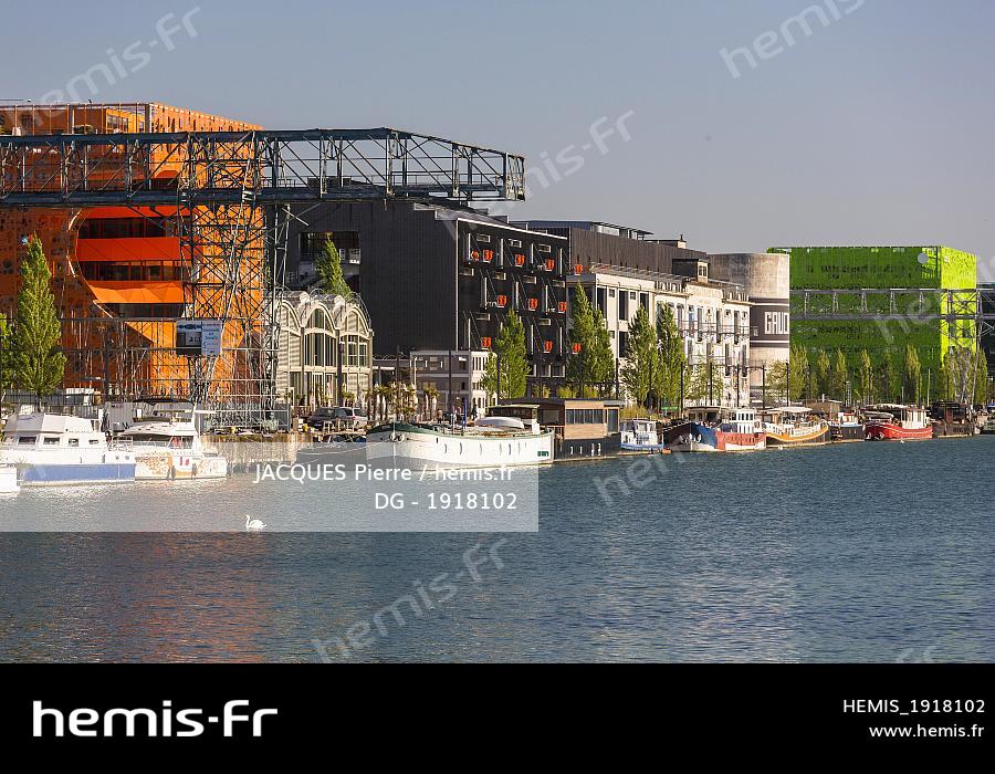 France, Rhône (69), Lyon, nouveau quartier de La Confluence au sud de la Presqu'île, Quai Rambaud, le Cube Orange imaginé par les architectes Dominique Jakob et Brendan MacFarlane et le bâtiment vert siège d'Euronews en arrière plan et la Sucrière ancien entrepôt des années 1930 avec son ancien portique et pont roulant situé sur l'ancien site de Port Rambaud