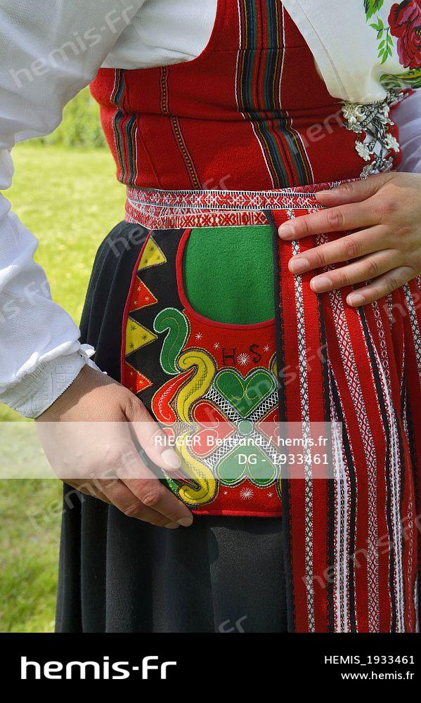Suède, comté de Dalécarlie, région de Leksand, jeune fille en costume traditionnel pour les célébrations du solstice d'été dans le petit hameau de Sunnanäng