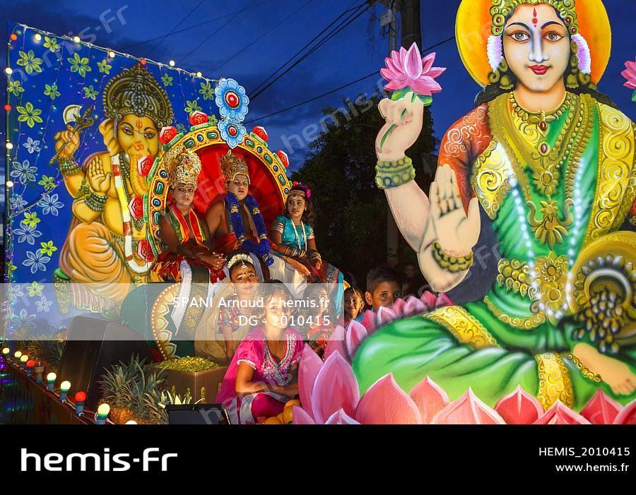France, Reunion Island (French overseas department), Saint Andre, Colosse park, religious holiday, party and parade chariot of Deepavali, Tamil children on a float parade
