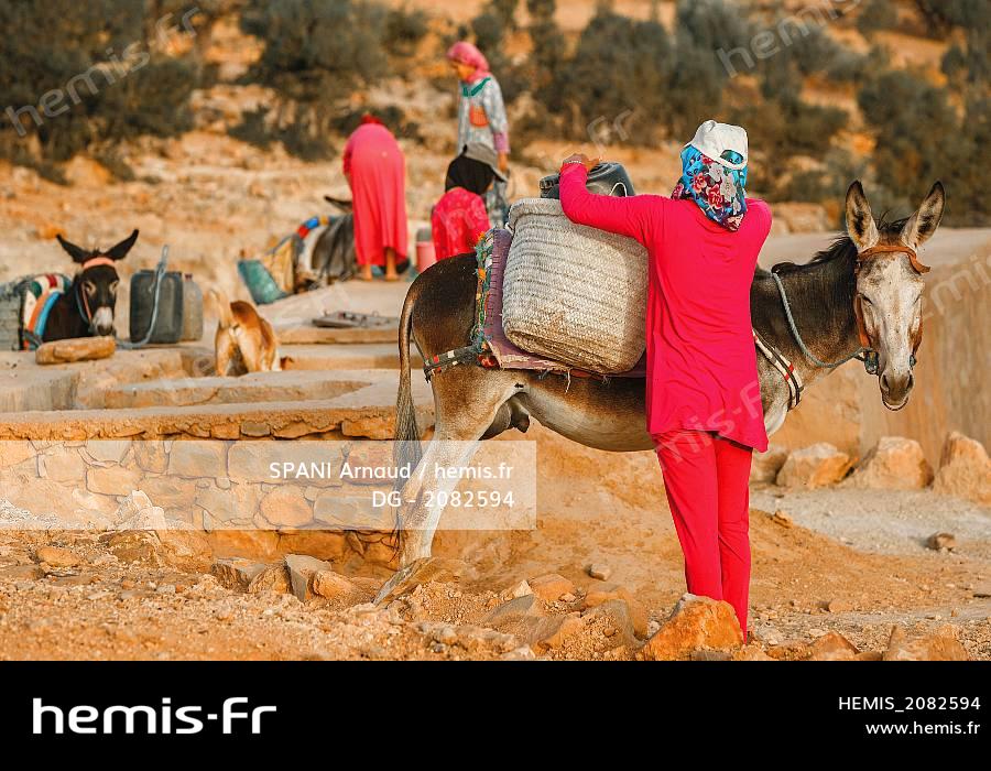 Morocco, Souss region, Tadrart, Moroccan women, prepare the transport of water from the well on a donkey