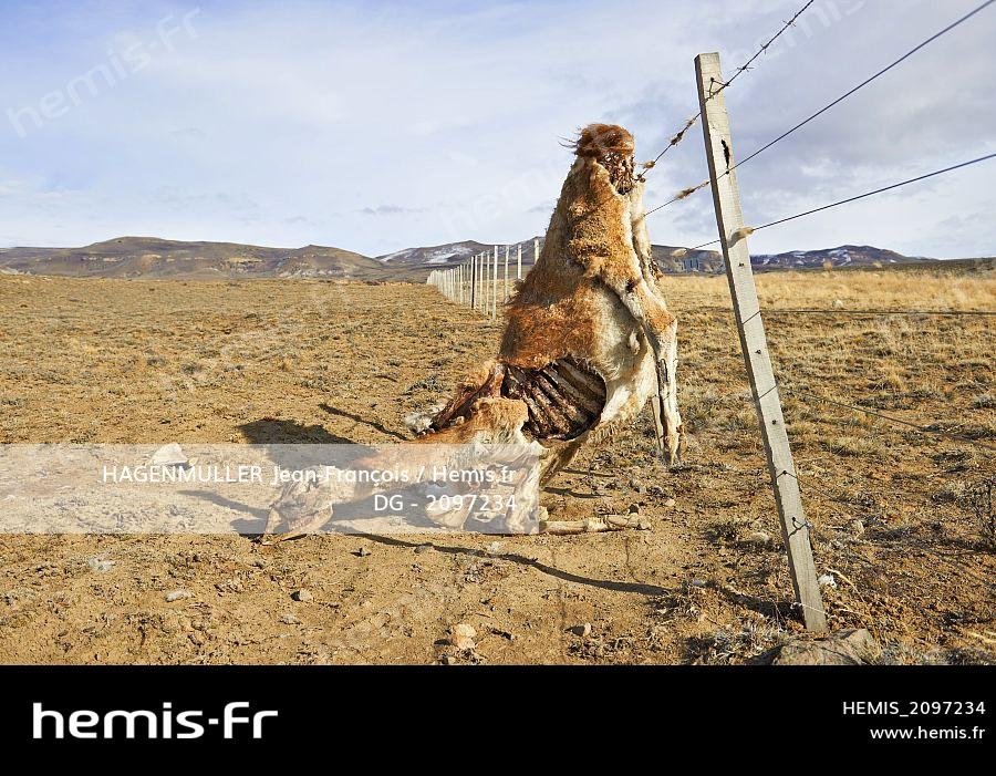 Argentine, Patagonie, Santa Cruz, El Calafate, Guanaco (Lama guanicoe) mort en traversant des fils de fer barbelés