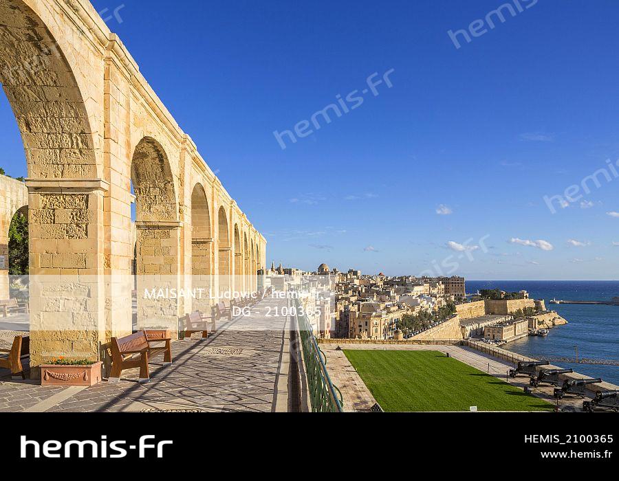 Malta, Valletta, city listed as World Heritage by UNESCO, Upper Barrakka Gardens, the public garden terrace founded in the 18th century with the canons of greeting battery (Saluting Battery)