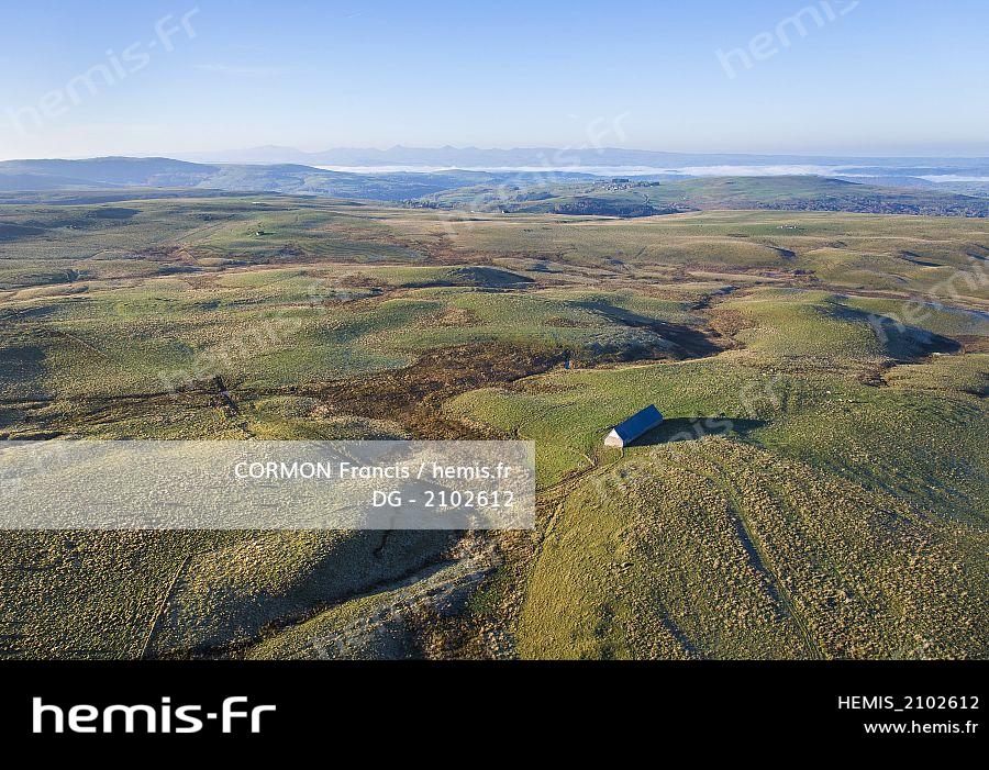 France, Cantal (15), Montgreleix , Parc Naturel Régional des Volcans, massif du Cezallier, buron (vue aérienne)