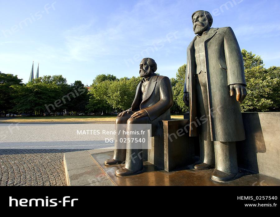 Allemagne, Berlin, quartier de Mitte, statue de Karl Marx et de Friedrich Engels au centre de Marx Engels Forum (ex RDA)