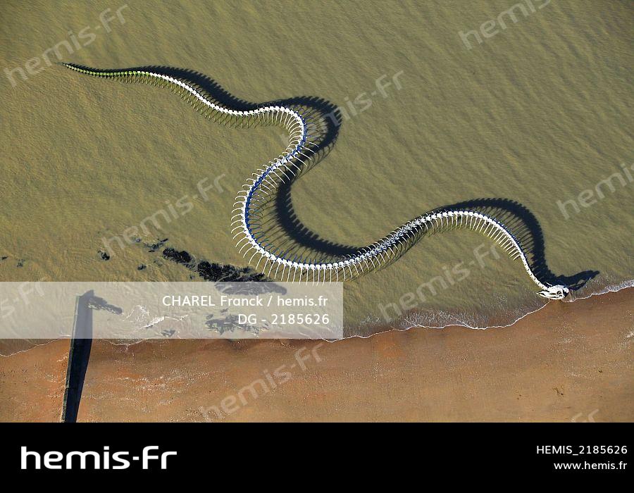 France, Loire Atlantique, Le Serpent d'Ocean is a work of the artist Huang Yong Ping, it represents a long skeleton of snake, it is installed to Saint Brevin les Pins (aerial view)