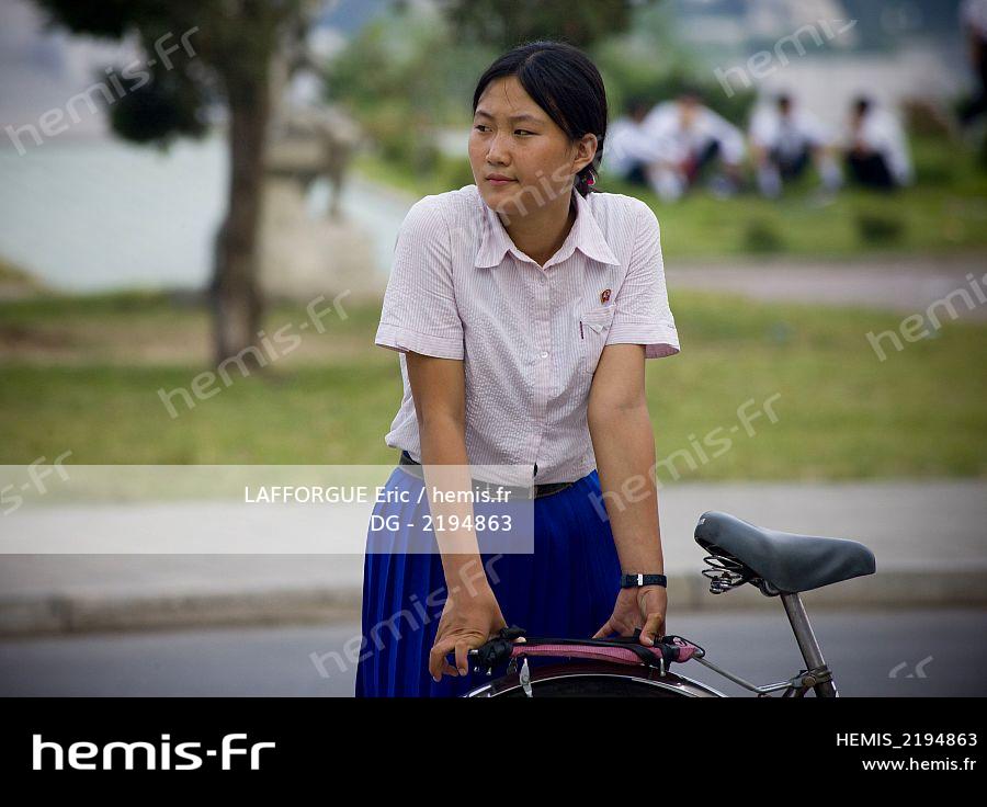 North Korea, Pyongyang District, Pyongyang, north korean girl with a bike