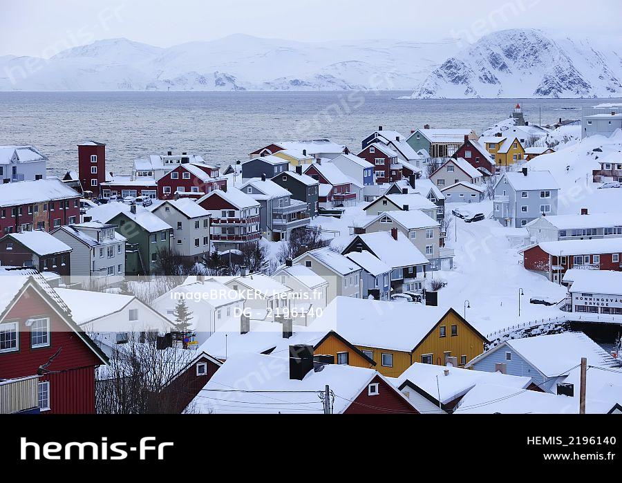 Village couvert de neige, le Porsangerfjord à l'arrière, Honningsvag, Mageroya, Nordkapp, comté de Finnmark, Norvège, Europe