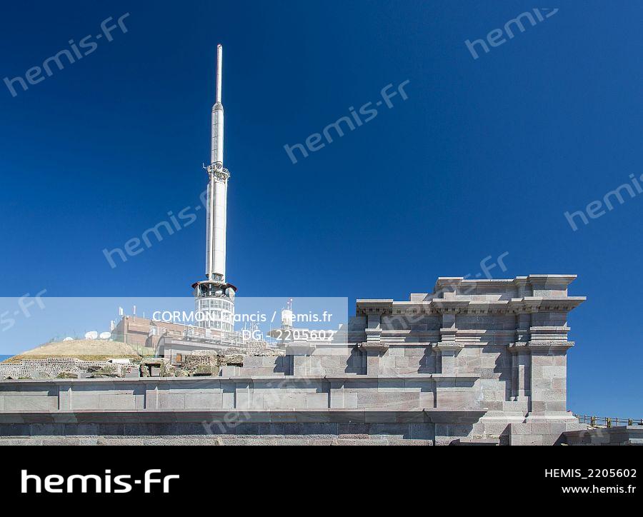 France, Puy-de-Dôme (63), zone classée Patrimoine Mondial de l'UNESCO, Orcines, Parc Naturel Régional des Volcans d'Auvergne, Chaine des Puys, le sommet du Puy de Dôme avec l'antenne et le temple de Mercure