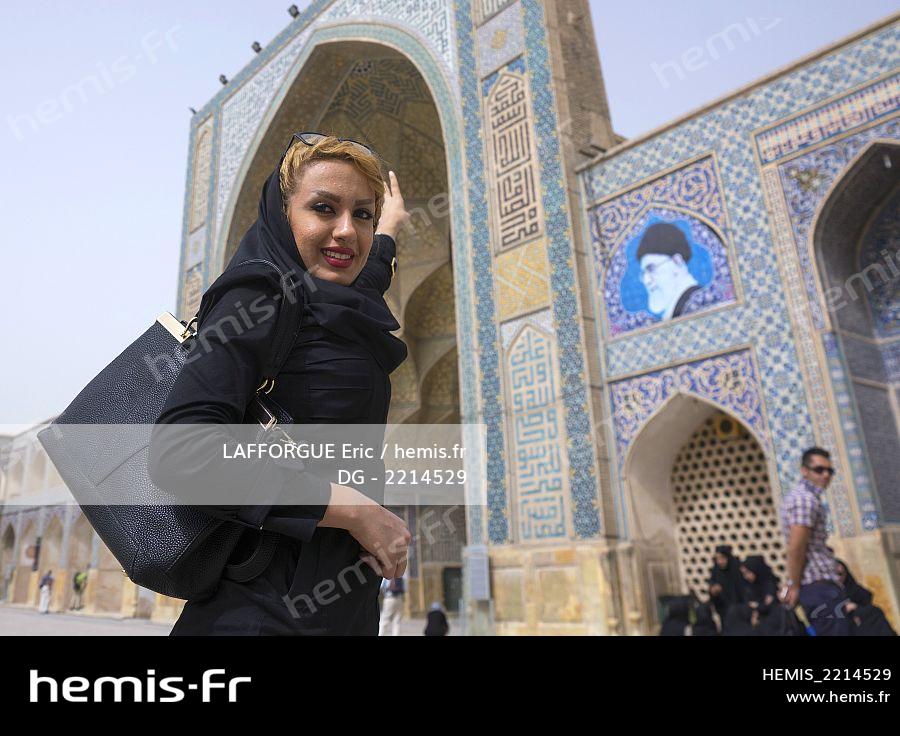 Iran, province d'Ispahan, Kashan, jeune femme blonde iranienne en face d'une mosquée