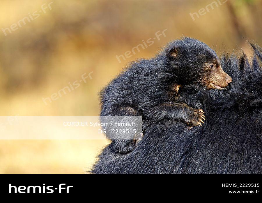 Asie, Inde, Karnataka, montagnes de Sanduru, Ours lippu ou ours lippu de l'Inde, ours paresseux (Melursus ursinus) , mère et petits, la mère porte ses petits sur le dos