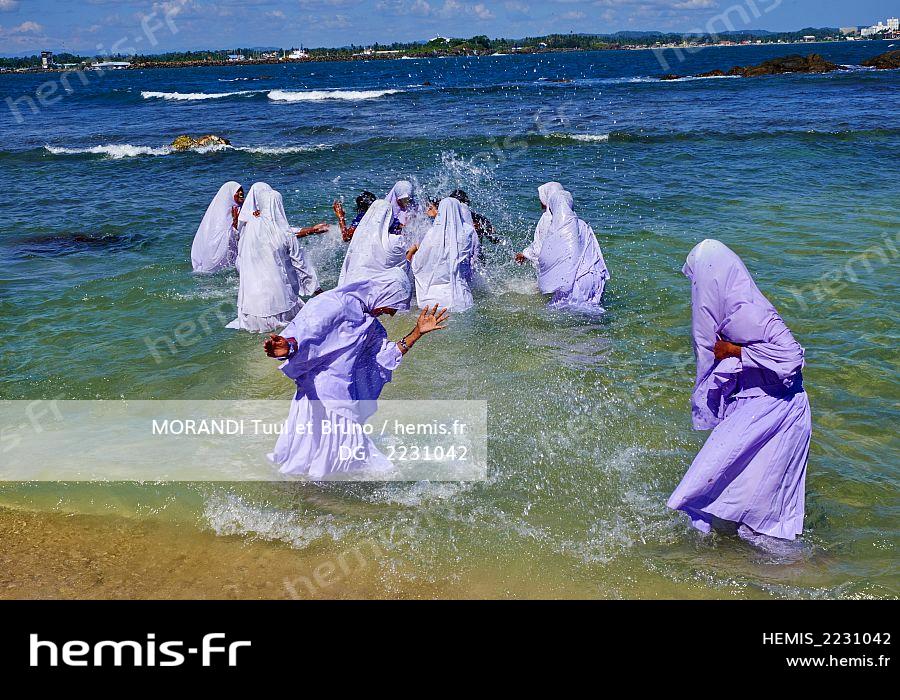 Sri Lanka, province du Sud, district de Galle, Galle, vieille ville classée Patrimoine Mondial de l'UNESCO, écolières musulmanes sur la plage
