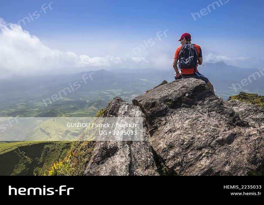 France, Martinique, Mount Pelee, active volcano at the northern end of the island, hiking on maintained trails, panoramic view from the top (alt : 1397m)
