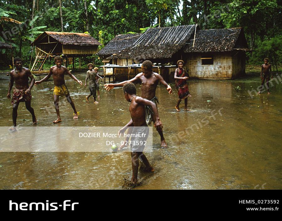 Papua New Guinea, New Ireland archipelago, East Coast, Tabar Simberi Island, village of Lao Kulip, the children play football under a tropical storm