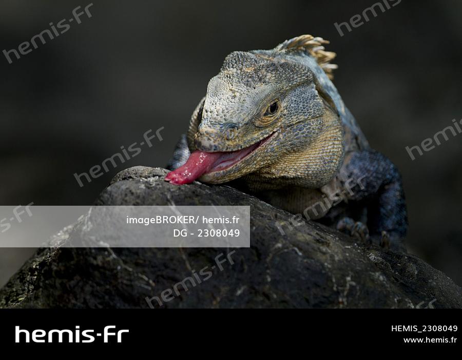 Black spiny-tailed iguana -Ctenosaura similis- with its tongue sticking out, on a rock, portrait, Manuel Antonio National Park, Costa Rica, North America