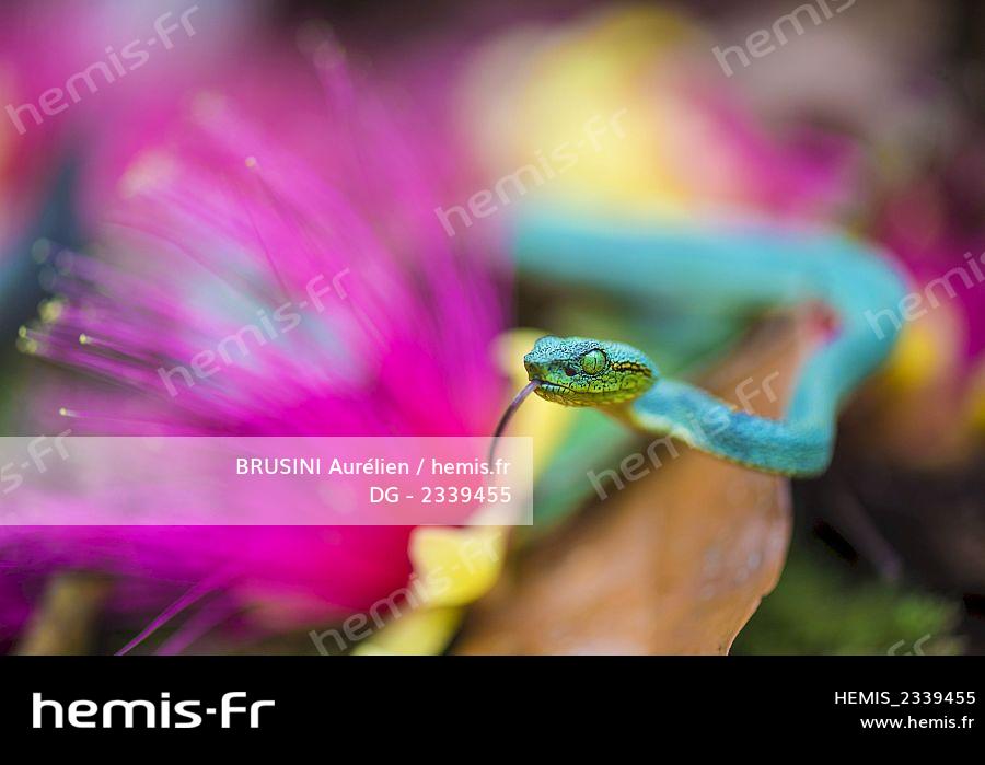 France, Guyane, Parc amazonien de Guyane, zone de coeur, Camopi, Bothrops bilineatus, vipère arboricole en chasse sur le mont Itoupé (830 m), second sommet de Guyane, dans la chaîne montagneuse des Monts Tabulaires, qui présente des écosystèmes particuliers jusqu'à sa forêt de nuages, dont l'étude fournira des indicateurs de changements climatiques globaux
