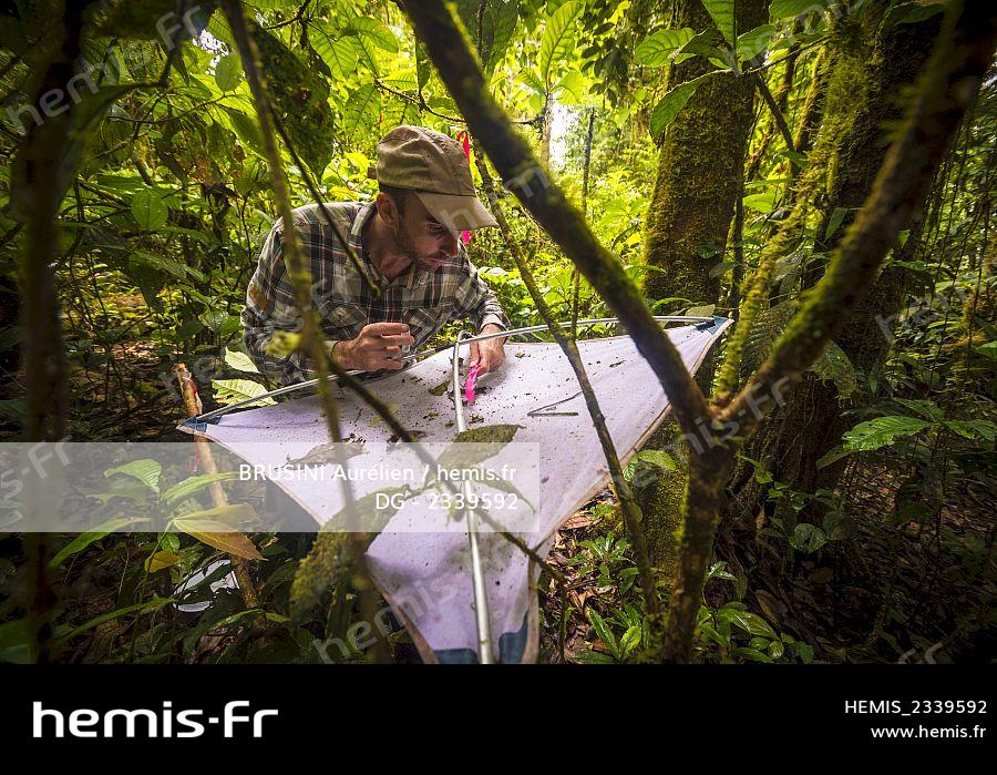France, Guyana, French Guyana Amazonian Park, heart area, Camopi, an arachnologist captures invertebrates in the cloud forest of Mount Itoupe (830 m), the second summit of French Guyana, in the mountain range of Table Mountains, which presents particular ecosystems until its cloud forest, whose study will provide indicators of global climate change