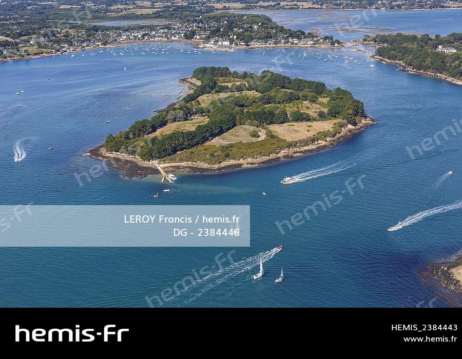 France, Morbihan (56), site mégalithique classé Patrimoine Mondial de l'UNESCO, l'île de Gavrinis et son tumulus (vue aérienne)