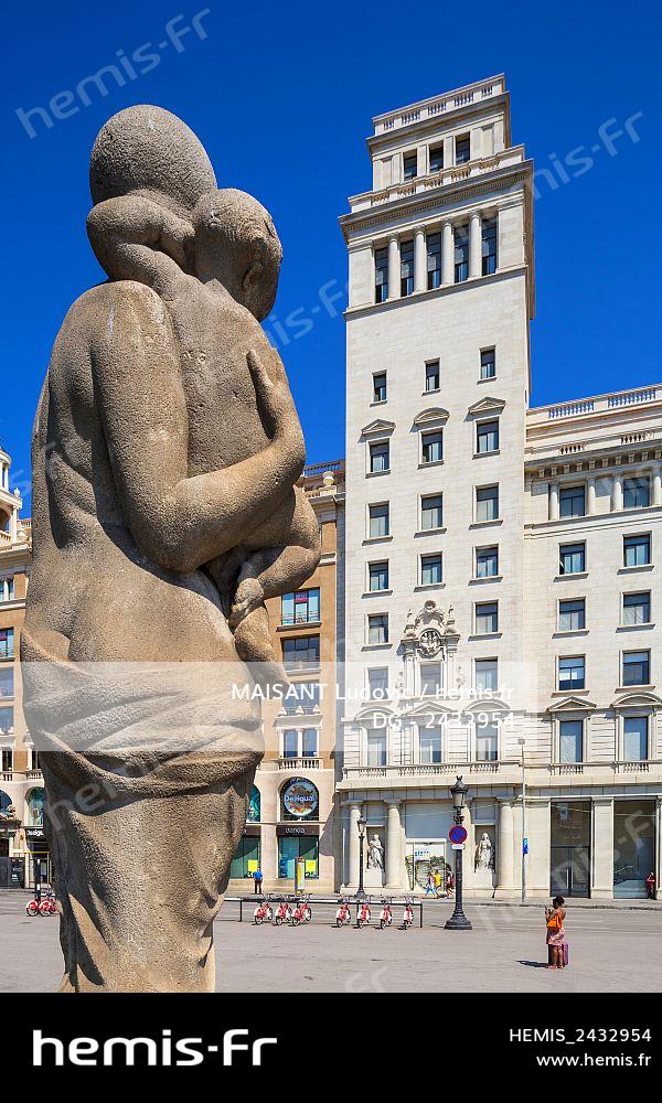 Spain, Catalonia, Barcelona, Plaza Catalunya (Placa de Catalunya) from the early 20th century sculpture entitled Maternity Vicenc Navarro