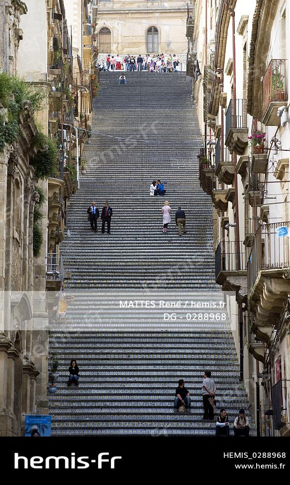 Italie, Sicile, Caltagirone, La Scalinata di Santa Maria del Monte, escalier monumental de 142 marches décorées de majolique au coeur de la ville