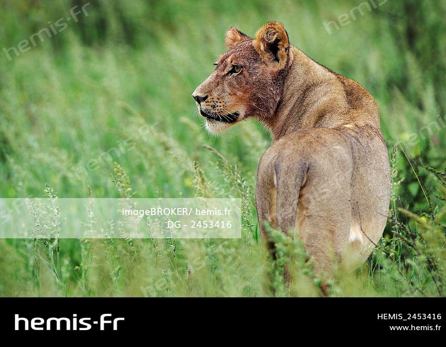 Lion -Panthera leo-, lioness with a blood-splattered head, Moremi Game Reserve, Botswana, Africa