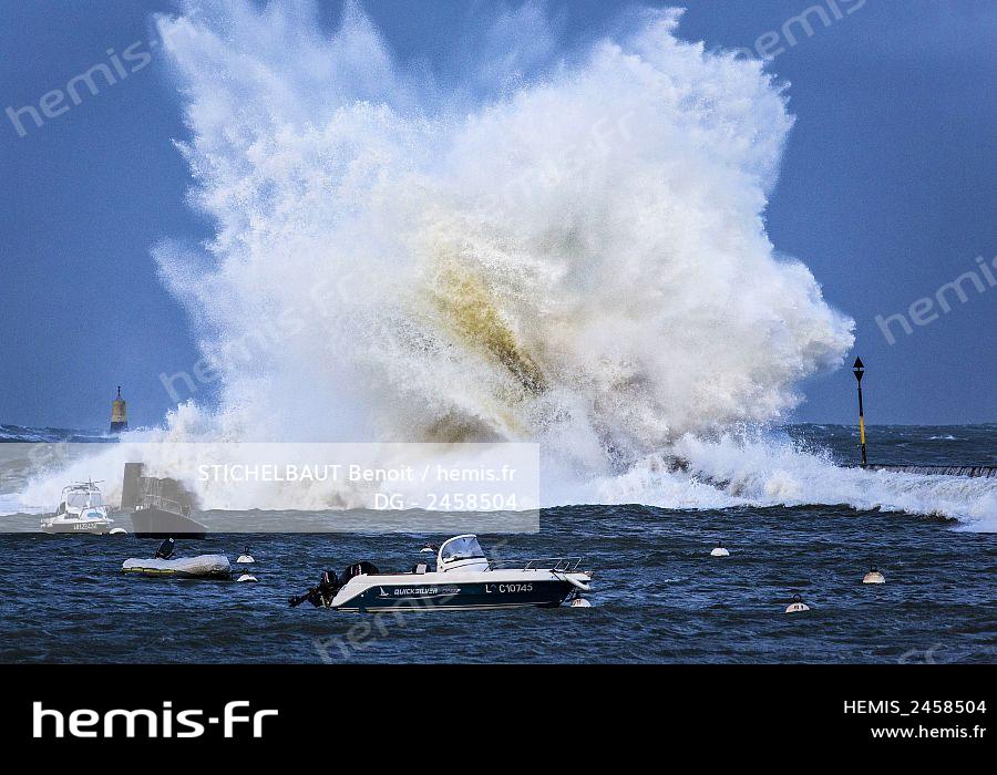 France, Morbihan, Ploemeur, wave on the harbour sea wall during a storm