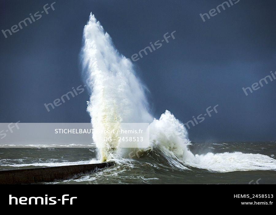 France, Morbihan, Ploemeur, wave on the sea wall of the harbour during a storm