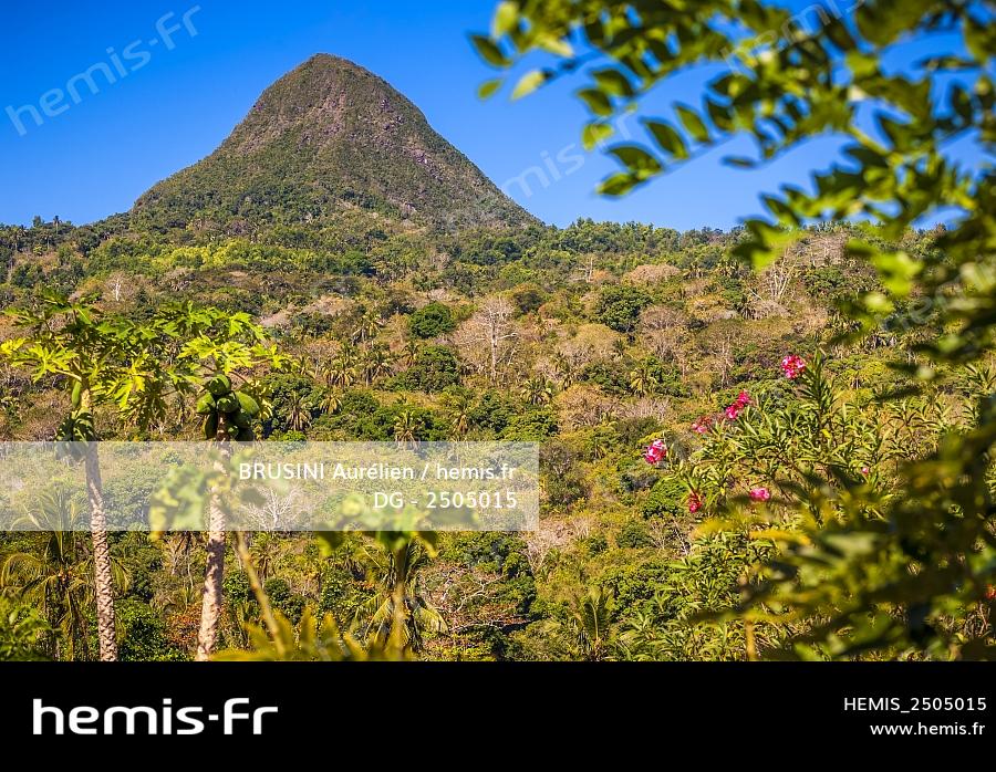 France, Mayotte island (French overseas department), Grande Terre, Mont Choungui (594 meters) with 2 papaya trees in the foreground